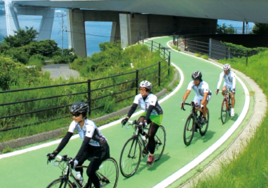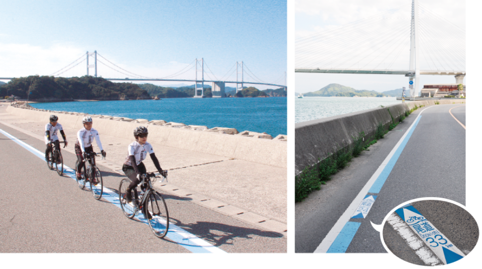 JR尾道駅からJR今治駅間に、サイクリングの推奨ルートとしてブルーラインを整備。しまなみ海道が発祥とされるブルーラインは、世界中から訪れるサイクリストの道しるべとなっています。