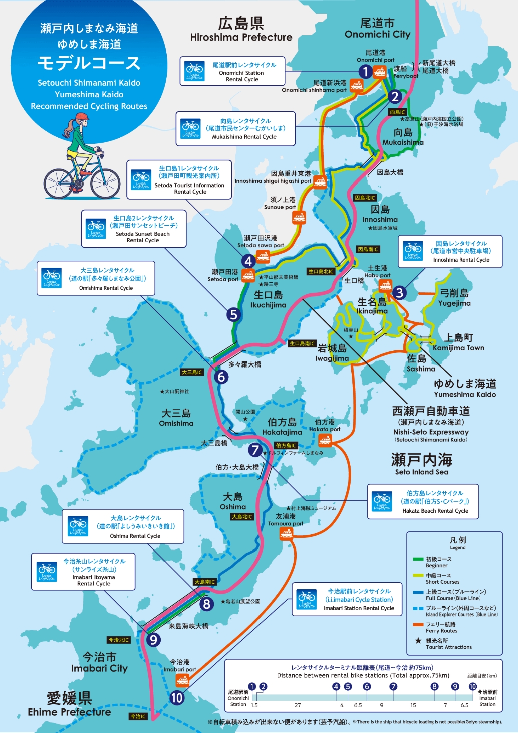 本州四国連絡道路のうち、尾道から今治を結ぶルートの通称。自動車道の橋に併設された歩行者・自転車専用道路は片道約70kmのサイクリングロードとなっています。