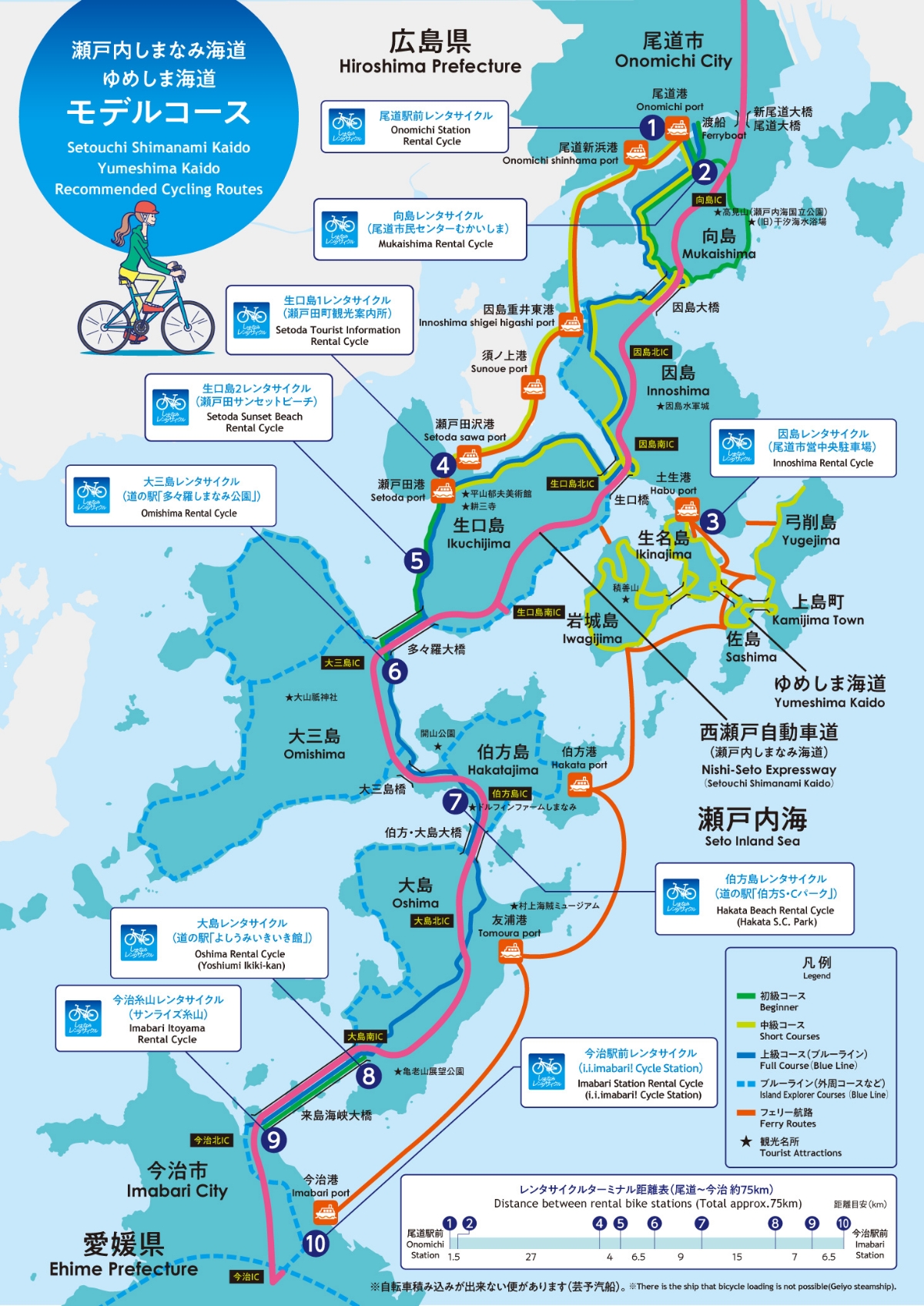 約30km | 3〜4時間 | 尾道から観光名所が多数ある生口島までの約30kmのサイクリングコースです。終点の「瀬戸田港」周辺には、耕三寺・平山郁夫美術館などおすすめスポット満載です。 |