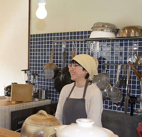 「まるふのお野菜ランチ(1000円)」は主菜、小鉢2品、漬物、ご飯、汁物のセット。この日の主菜は豆乳のシチューでした。にんじんなどの野菜がゴロゴロと大きくたっぷり入っています。そして小鉢は山東菜のおひたし、島で採れたひじきとヤーコンのサラダ。漬物は愛媛の伝統野菜「緋かぶ」の甘酢漬けと滋賀の伝統野菜「日野菜」のさくら漬。ご覧のとおり本当に野菜がたくさん! 「このランチだけで何品目の野菜が摂れるんだろう」と感心してしまうほど健康的なランチです。主菜は季節ごとに変わり、春はハーブのコロッケ、夏は夏野菜の揚げ出しの予定だとか。使われている野菜は自家製なのもポイントです。
