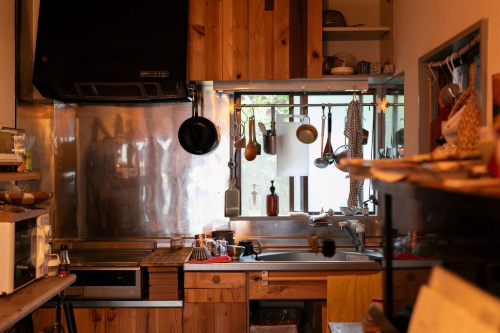 1階には共用のキッチンとお風呂を完備。冷蔵庫や電子レンジ、調理器具、お皿なども揃っており自由に利用することが可能です。ボディソープやシャンプーは浴室内に設置してありますが、タオル、歯ブラシ、ブラシ、パジャマなど個人的に使用するものは持参を。
