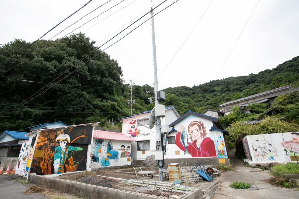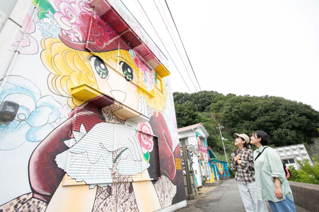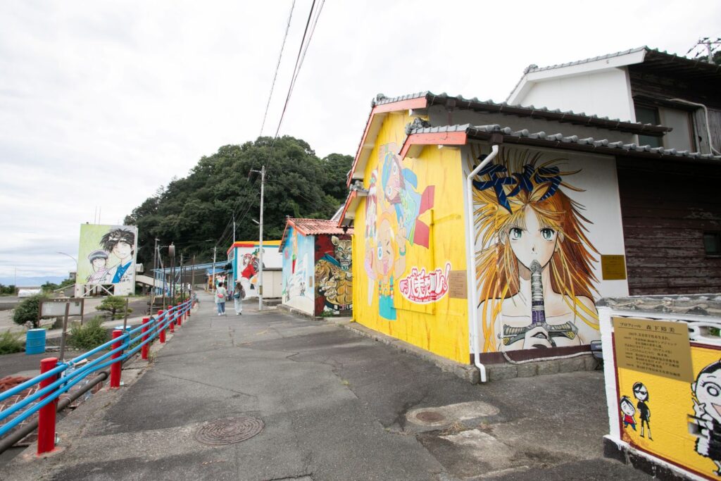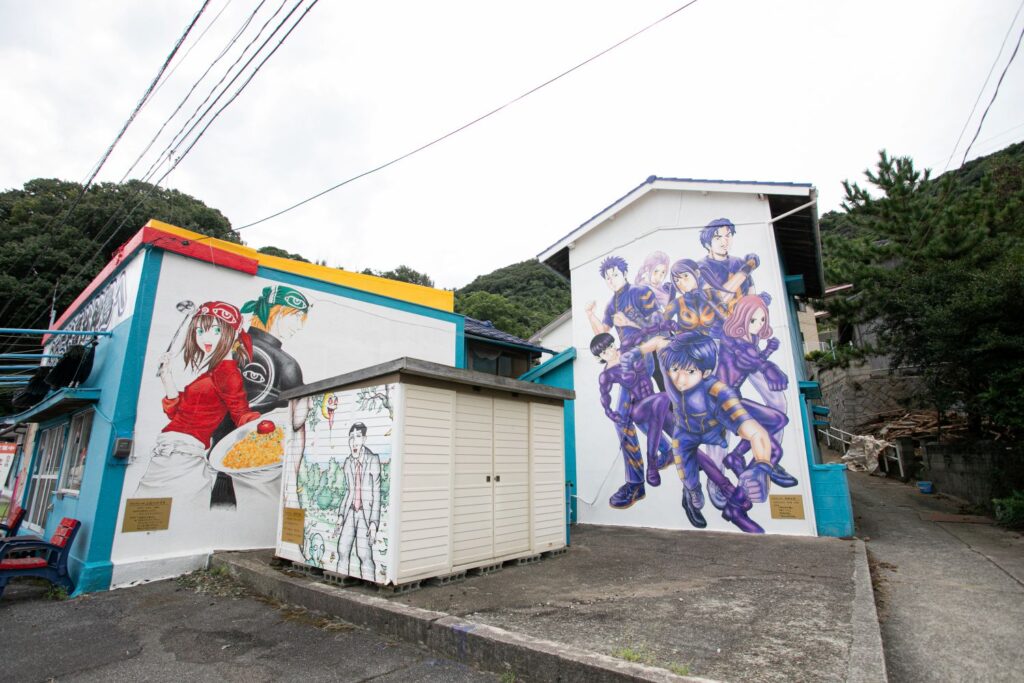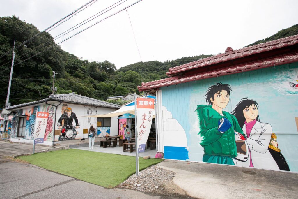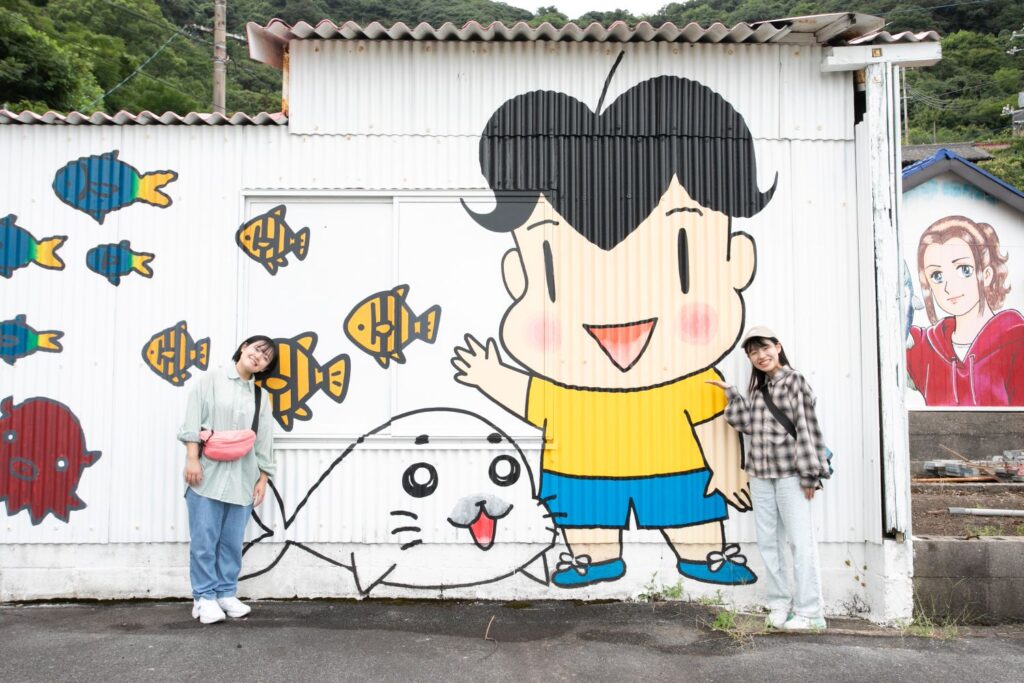 「Dr.コトー診療所」や「少年アシベGO!GO!ゴマちゃん」など、日本を代表する漫画家の協力を得て、人気キャラクターが描かれた壁画アートが島内に点在。マンガ島と呼ばれ、日本全国から観光客が訪れています。高井神港務所の横を通ってメイン通りへ出ると、目に飛び込んでくるのはマンガ・アニメのキャラクターを忠実に描いた壁画の数々。