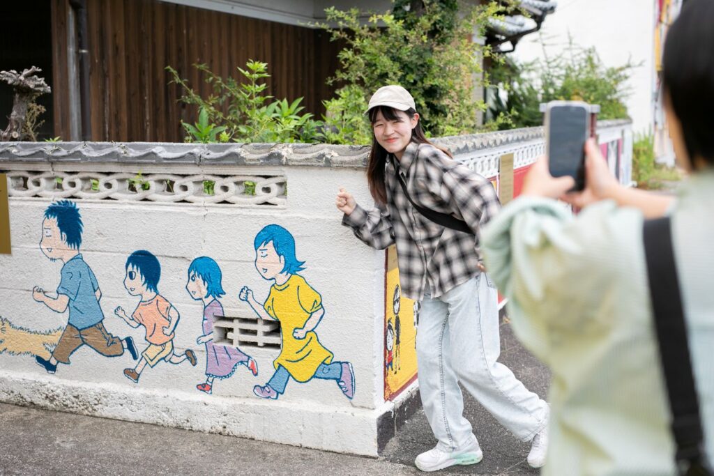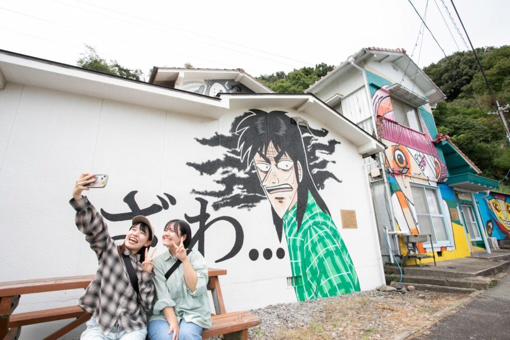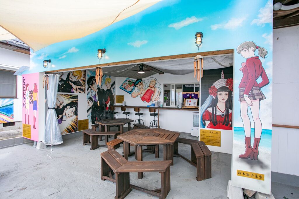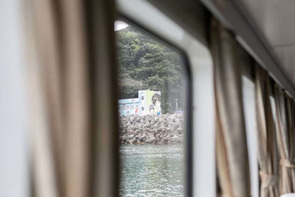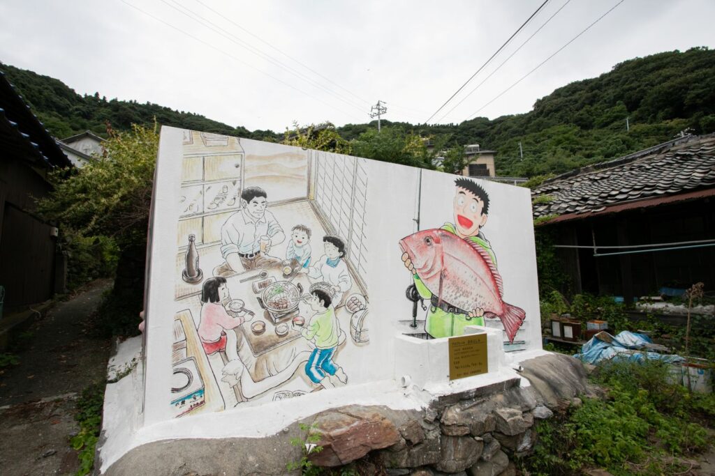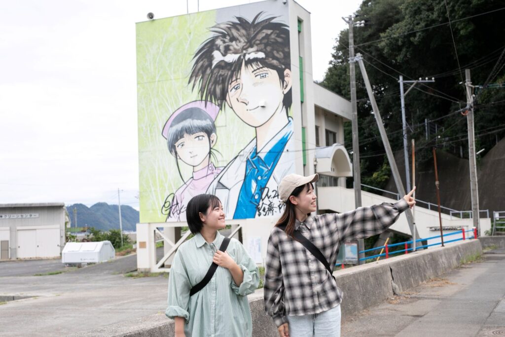 「Dr.コトー診療所」や「少年アシベGO!GO!ゴマちゃん」など、日本を代表する漫画家の協力を得て、人気キャラクターが描かれた壁画アートが島内に点在。マンガ島と呼ばれ、日本全国から観光客が訪れています。高井神港務所の横を通ってメイン通りへ出ると、目に飛び込んでくるのはマンガ・アニメのキャラクターを忠実に描いた壁画の数々。