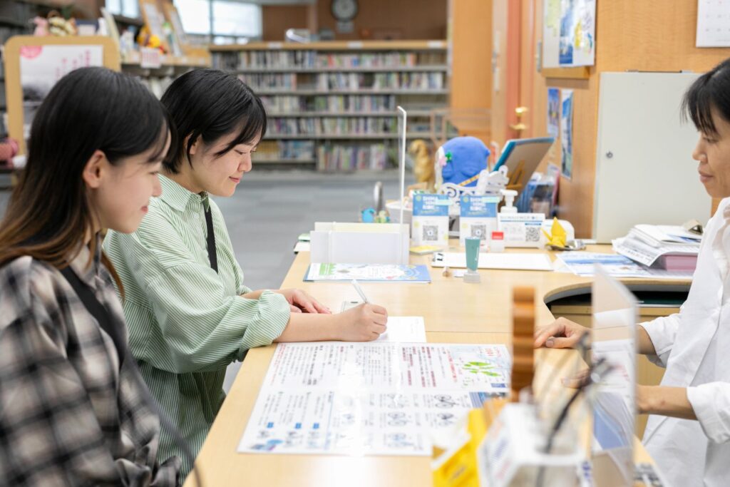 弓削港から徒歩3分。向かった先は、上島町の観光交流拠点「せとうち交流館」。ここで自転車をレンタルします。館内に入って右手に位置するメディアセンターで利用申込書を記入します。選んだのは、電動アシスト自転車。