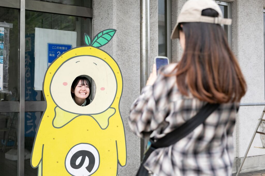 因島の魅力をあちらこちらでPRする「はっさくん」の顔出しパネルを発見!少し時間があるので、もちろん記念撮影♡