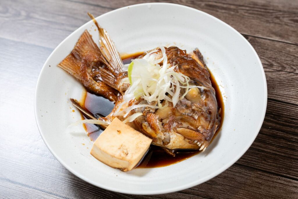 地もの鯛を甘辛く煮付けた鯛のあら炊き(700円)。潮流の速い上島町近海で育った鯛は、身の締まりがよく甘みが強いのも特徴。