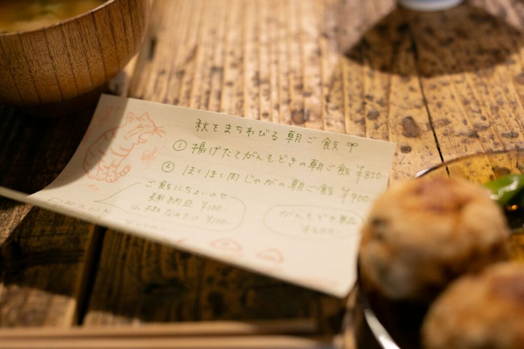 お品書きには2種類の朝ごはん。ひとつは看板メニューのがんもどき、もうひとつは季節の美味しい食材が主役です。
