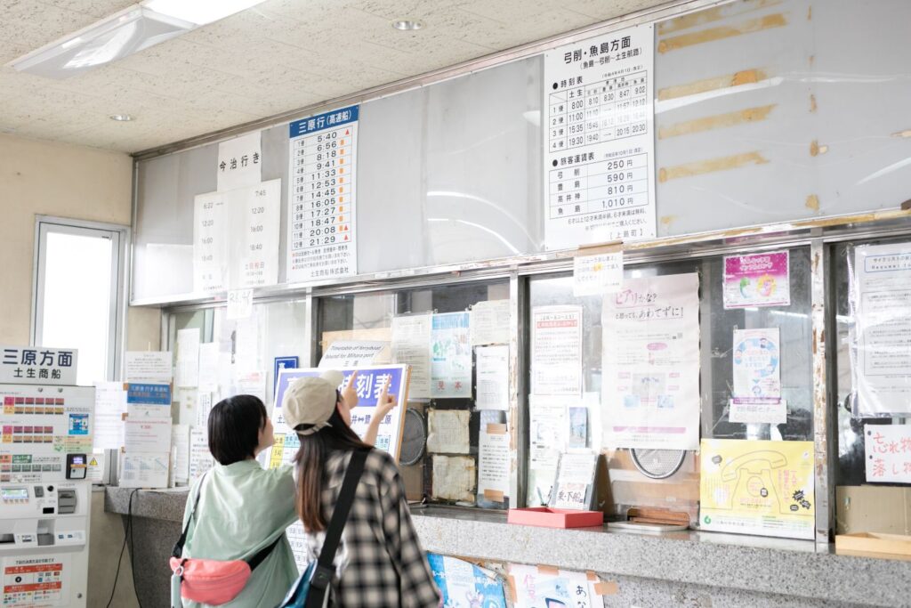 1日4便しかないので、観光で行くなら土生港を11:00発の2便に乗って、帰りは高井神港を13:15発の3便に乗るのがベスト。※2025年10月現在
