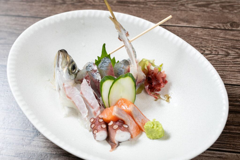 刺身の盛り合わせ(1,000円)。弓削近海をはじめ、瀬戸内海で獲れた鮮魚を楽しめます。旅で島を訪れたならまず味わいたい一皿です。