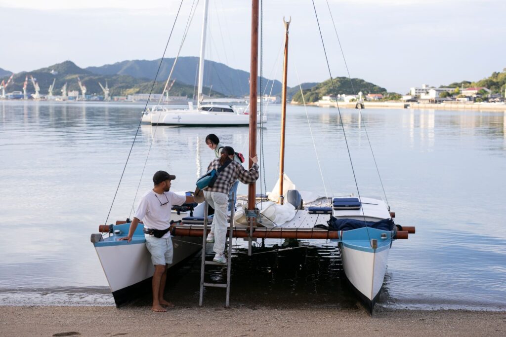 「こんにちは!」と笑顔で迎えてくれた齋藤サムさん。『島旅ヨット』のキャプテンであり、私たちをクルージングに連れて行ってくれるカタマランヨットを作った船大工でもあります。