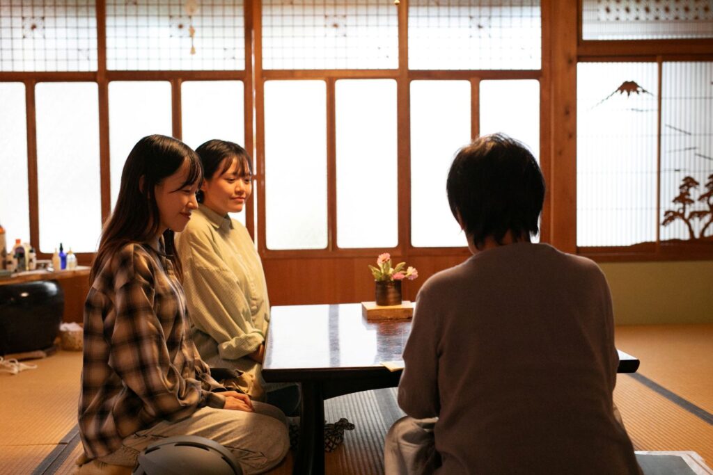 1階の和室でチェックインの手続きを。宿には食事の用意がないので、夕食の相談も。徒歩15分圏内のお店へ行くのもよし、スーパーで食材を買ってきて調理するのもよし。暮らすように自由に過ごせるのがゲストハウスの魅力。