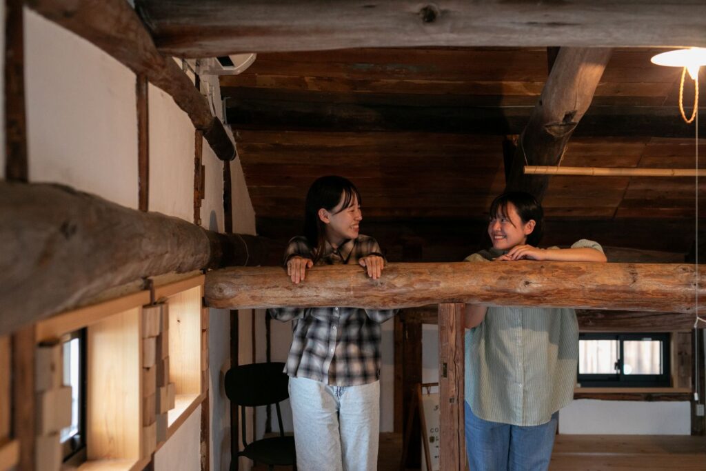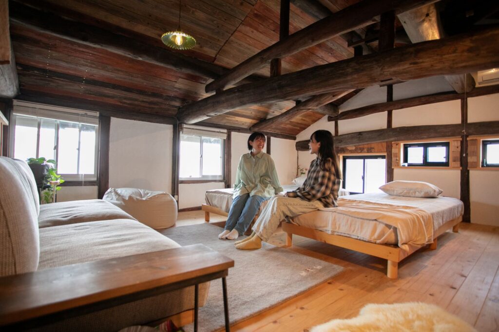 大きな梁と屋根裏ならではの低い天井。古い日本家屋の趣深さを残しつつもモダンな空間は外国から訪れる観光客からの人気も高く、長く海外で生活をしていた明子さんだからこそ醸し出せる居心地のよさがありました。