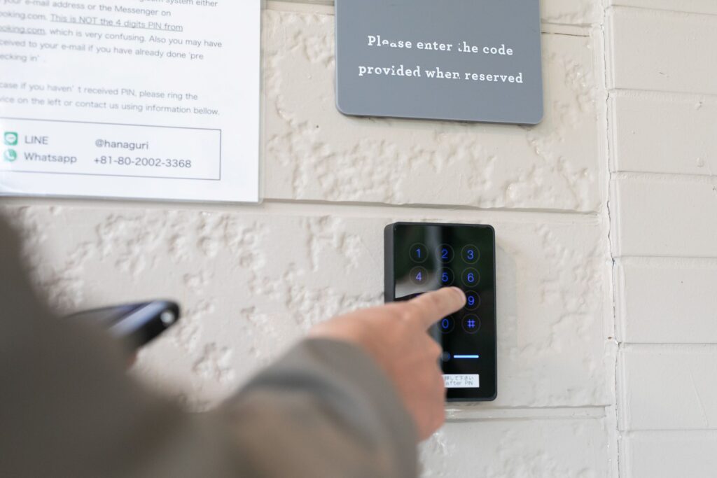 事前にオンラインで予約後、メールで事前チェックイン。その際に発行された暗証番号を玄関で入力して入館します。