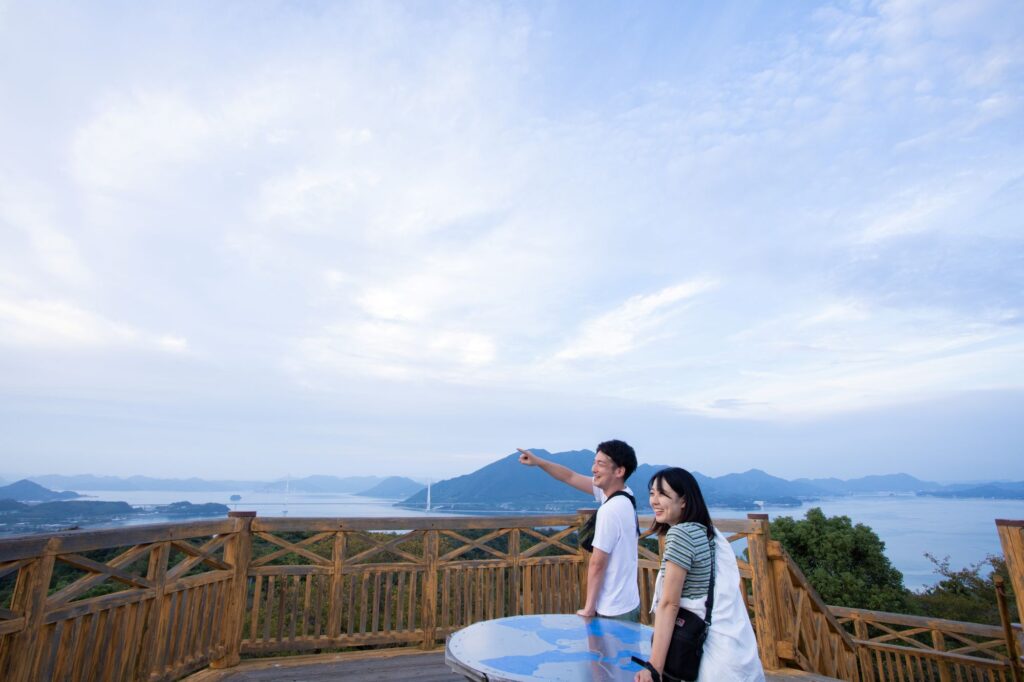 自転車をとめて遊歩道を歩いて展望台へ。サイクリングで走った「伯方・大島大橋」のほか、多々羅大橋なども見えます。瀬戸内海に浮かぶ島々などをぐるっと一望できる圧巻のビュースポットです。