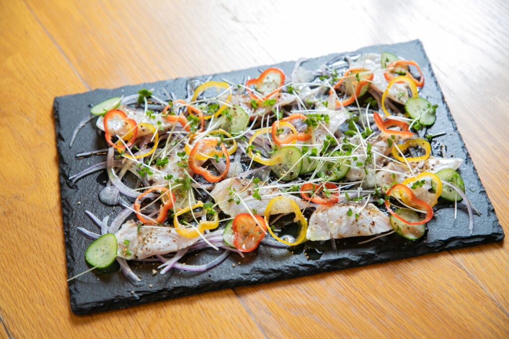 本日の鮮魚のカルパッチョ(1,200円)。この日は近海で獲れた「しまなみ鯛」。甘みを感じられる、身の引き締まった鯛です。