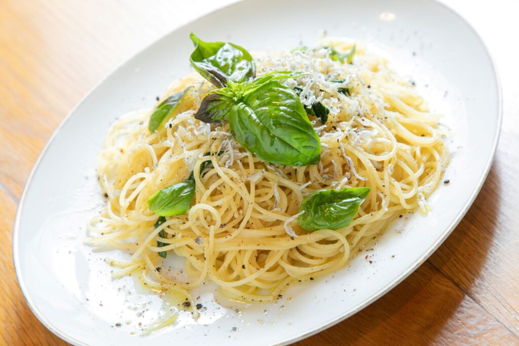 愛媛県産ちりめんとフレッシュバジルの和風パスタ(1,200円)。