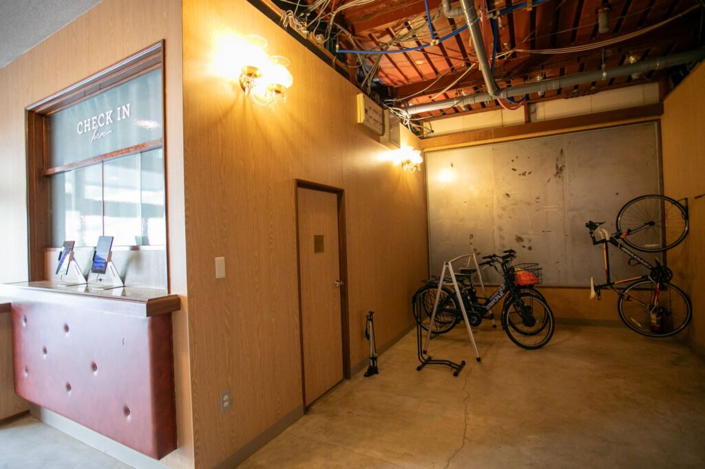 受付奥に広い駐車スペースを完備。自転車はこちらへ。