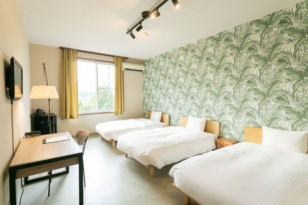 セミダブルベッドを3台配置したトリプルルームは友だち同士やファミリーでの旅行にぴったり。