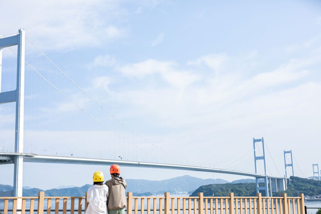 目の前に見えるのは、全長約4kmの世界初の三連吊橋「来島海峡大橋」。渡る前に休憩スポットの「サンライズ糸山」へ立ち寄ります。