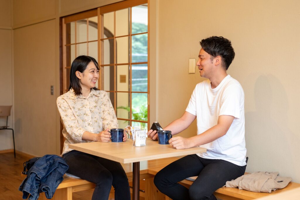 朝は「HANAGURI」のコミュニティルームで旅行のプランを話し合って出発。