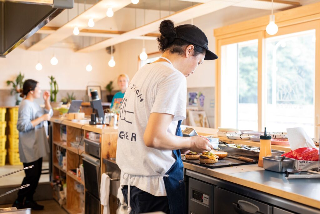 オープンキッチンは調理をしながらお客さんとの会話も弾む場所。カウンターで注文をしてからハンバーガーができるまで、カウンターのそばで、できあがっていく様子を見守るお客さんも多いそう。