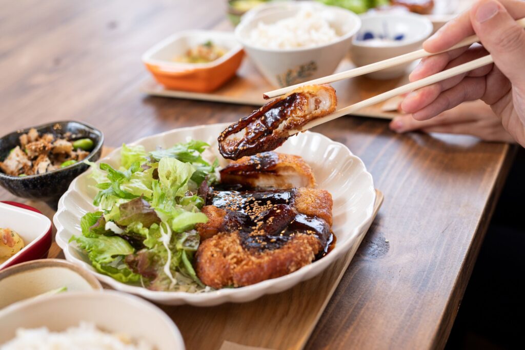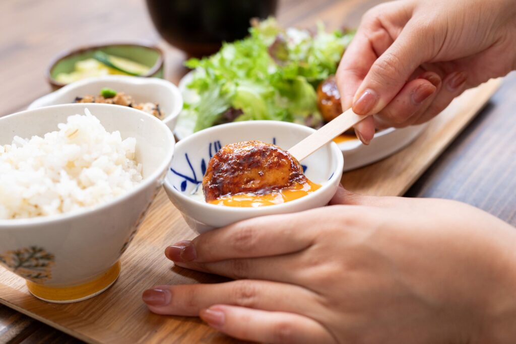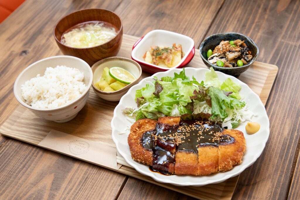 この日のメインはみそカツ。ほか、小鉢(豆腐とひじきの煮物・ヒスイ茄子のスダチ浸し・ジャーマンポテト)、かき玉汁、もち麦ごはんが並びます。