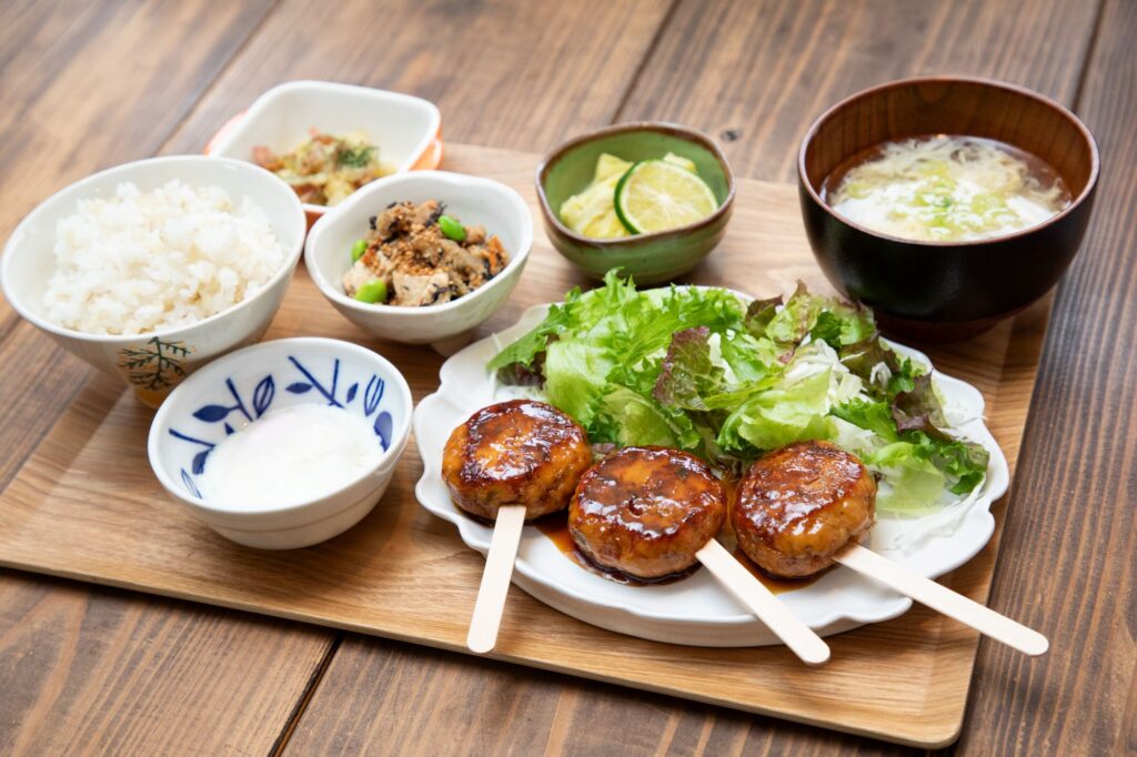 ランチは毎月1~2種類(各1,600円)を用意。こちらのメインはレンコン入り鶏つくね 温玉付き。ボリューム満点のメインと、店主のお母様の菜園で採れた野菜をたっぷり使った小鉢3種と、汁物、もち麦ごはんがセット。