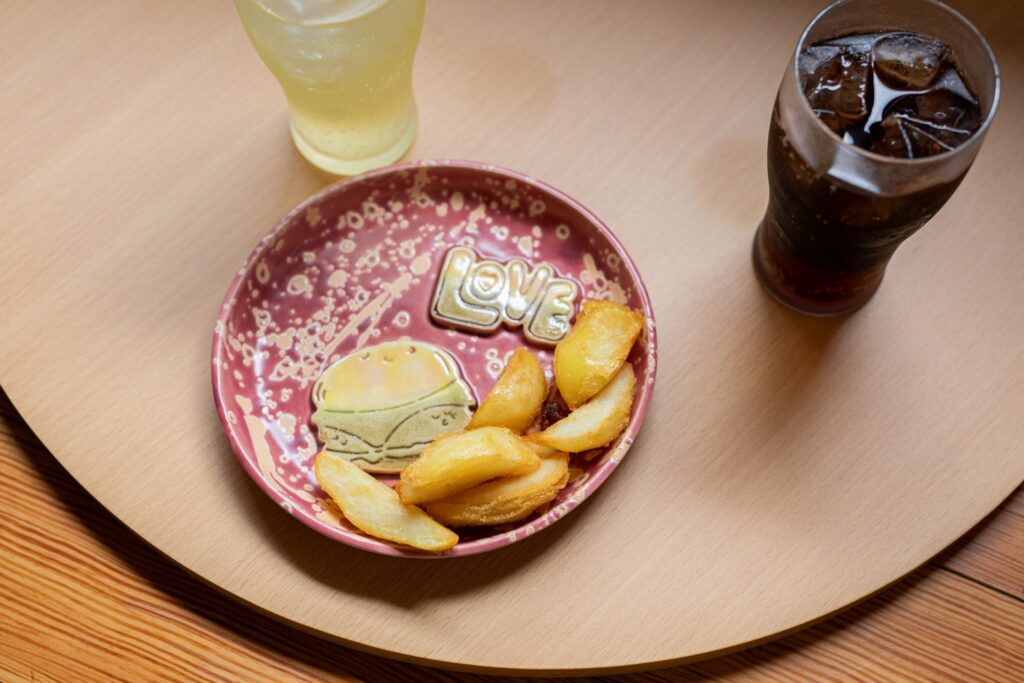 ポテト・ドリンクセット(+400円)。東京時代にお世話になったカフェのオーナーがプレゼントしてくれたオリジナルのお皿にも注目を~。