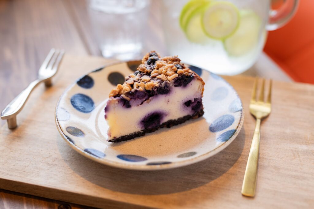 畑で採れた自家製ブルーベリーのクランブルチーズケーキ。シルバーのフォークとスプーンをあしらったデザートトレイは店主の手作り。