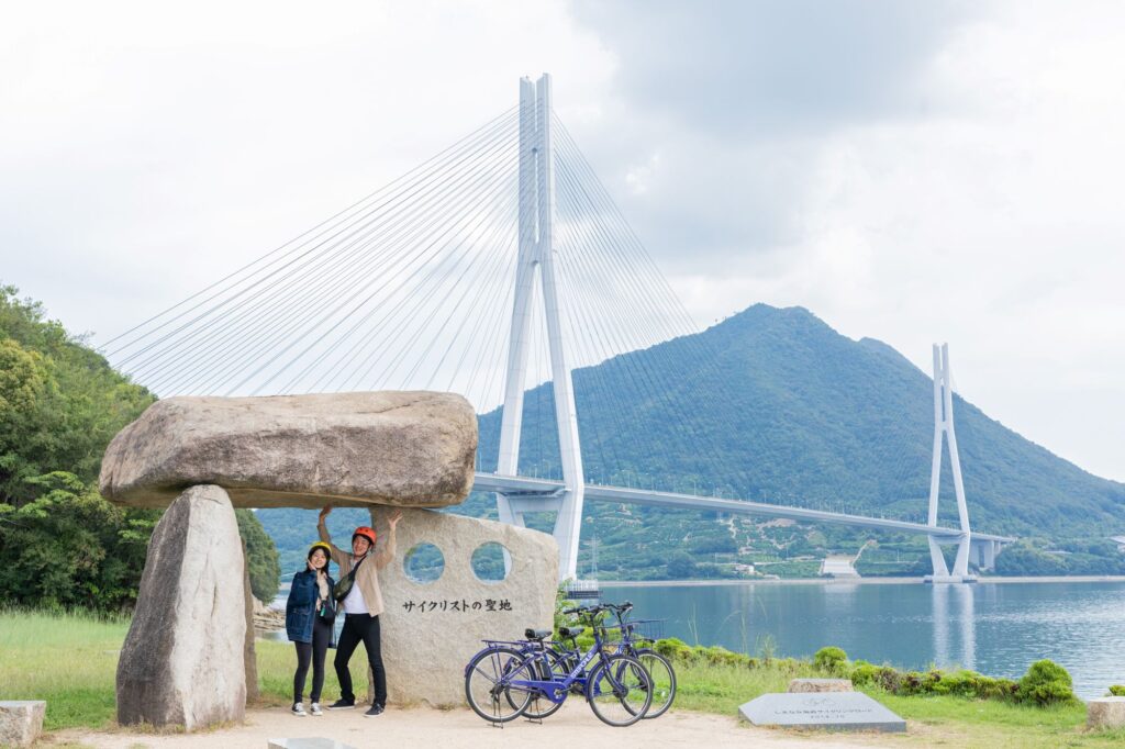 しまなみ海道「サイクリストの聖地」を記念した石のモニュメントで記念撮影。背景には多々羅大橋が入るベストフォトスポットです。