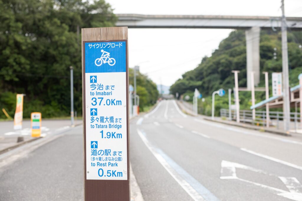 しまなみサイクリングロードには主要スポットまでの案内・距離表示があり、ブルーラインはその推奨ルートを示しています。