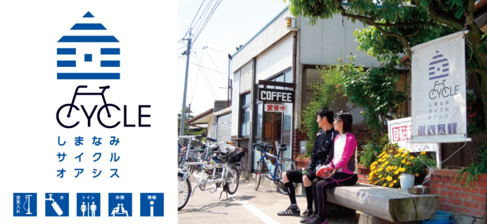 小売店や民宿などが参加し、サイクリストが気軽に立ち寄れる休憩所を開設しています。空気入れや自転車スタンド、ベンチなどが設置されているほか、給水やトイレの利用などが可能です。